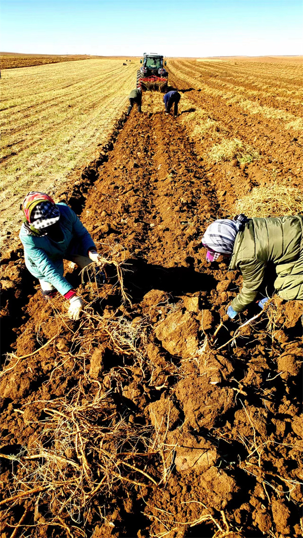 近日固阳县永茂丰农牧业专业合作社有机蒙古黄芪种植基地地里,大型专业收割机开过,地下的黄芪被连根带起,运输车辆在农田里来回穿梭,村民们正在拾捡黄芪,看到收获好品相好、质优的有机黄芪让农户们感受到丰收的喜悦。
