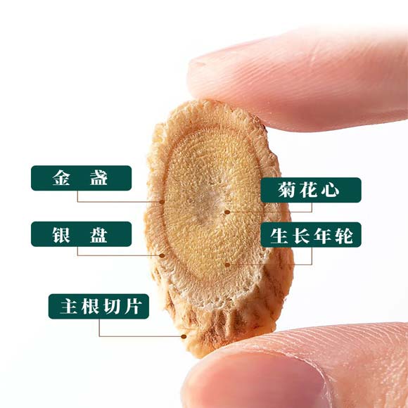 固阳黄芪呈圆柱形,质坚而绵,条直、均匀、分枝少;外观黄褐色,表面有不规则的纵皱纹或纵沟;根断面外白内黄,粉性足,韧皮部黄白色,有放射状的裂隙;木质部淡黄色似菊花心,约占半径的2/3.气微弱而特异,味微甜,嚼之有豆腥气。